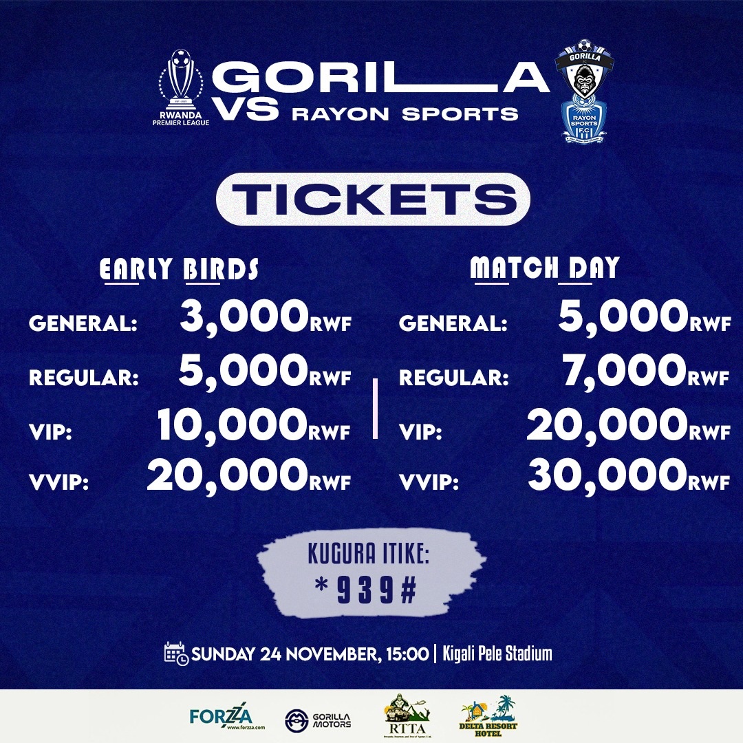 Muri VIP abari kugura amatike mbere bari kwishyura 10.000 FRW mu gihe abazagura ku munsi w’umukino bazishyura 20.000 FRW. Muri VVIP ubu bari kwishyura 20.000 FRW naho ku munsi w’umukino ni 30.000 FRW.