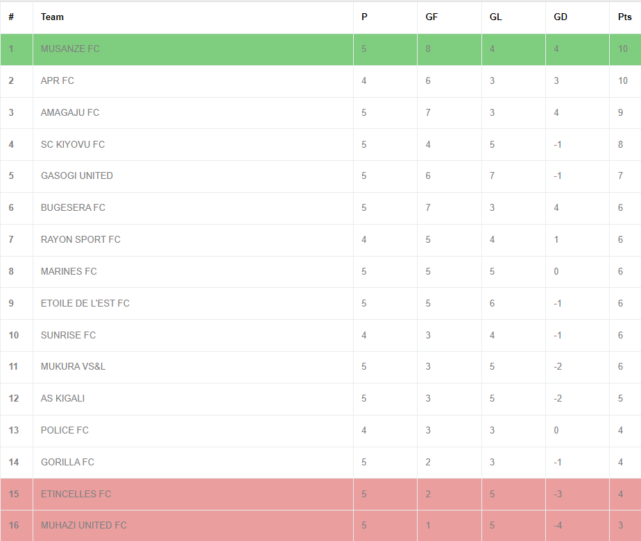 Ku rutonde rw’agateganyo, Musanze FC iracyayoboye n’amanota 10 inganya na APR FC ariko Musanze FC ikaba izigamye ibitego 4 mu gihe APR FC izigamye ibitego 3.