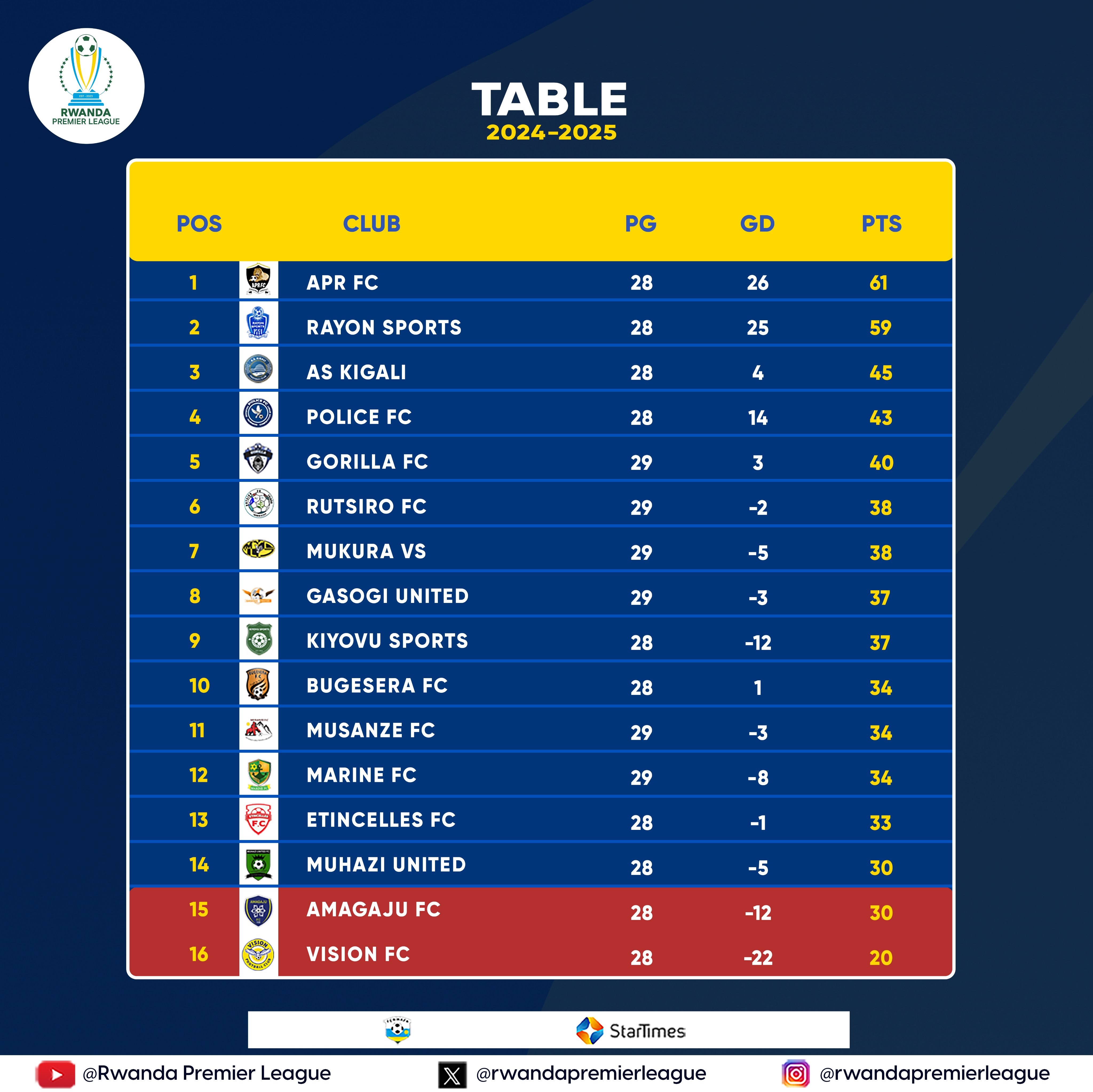 Ku munsi wa nyuma Musanze FC izasura ikipe ya APR FC naho Mukura VS isure Vision FC.