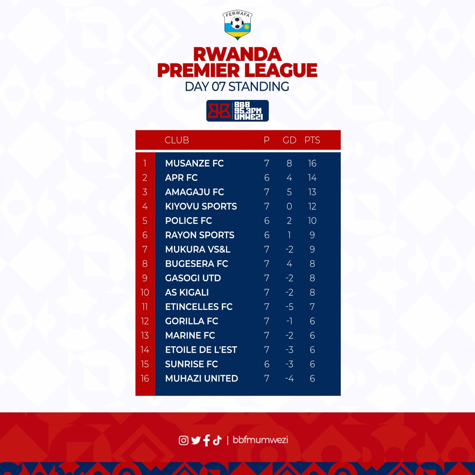 Nyuma y’umunsi wa 7 wa shampiyona, Musanze FC ni iya mbere n’amanota 16, APR FC ni iya kabiri n’amanota 14.