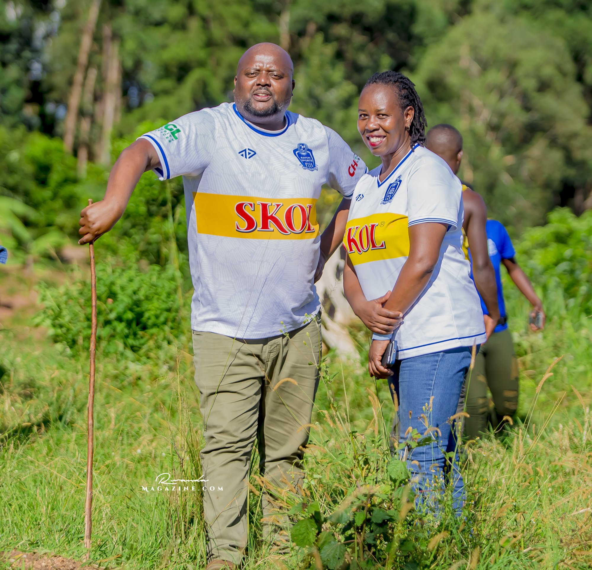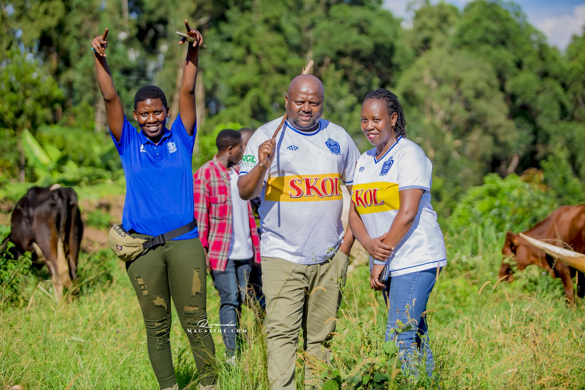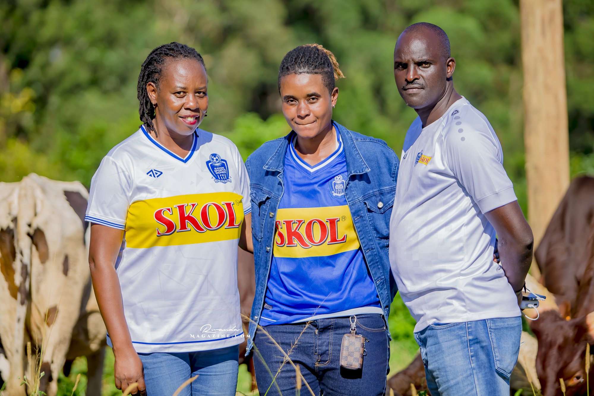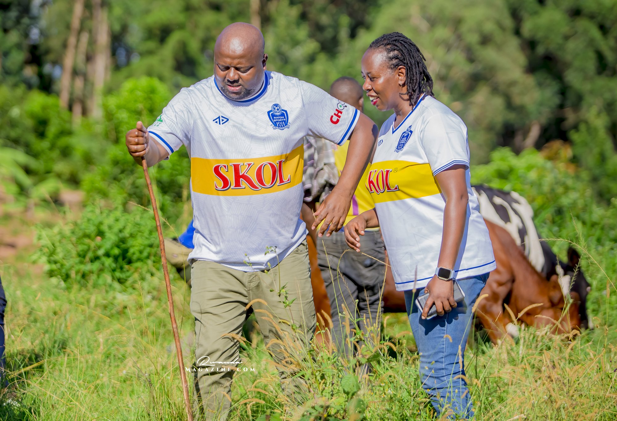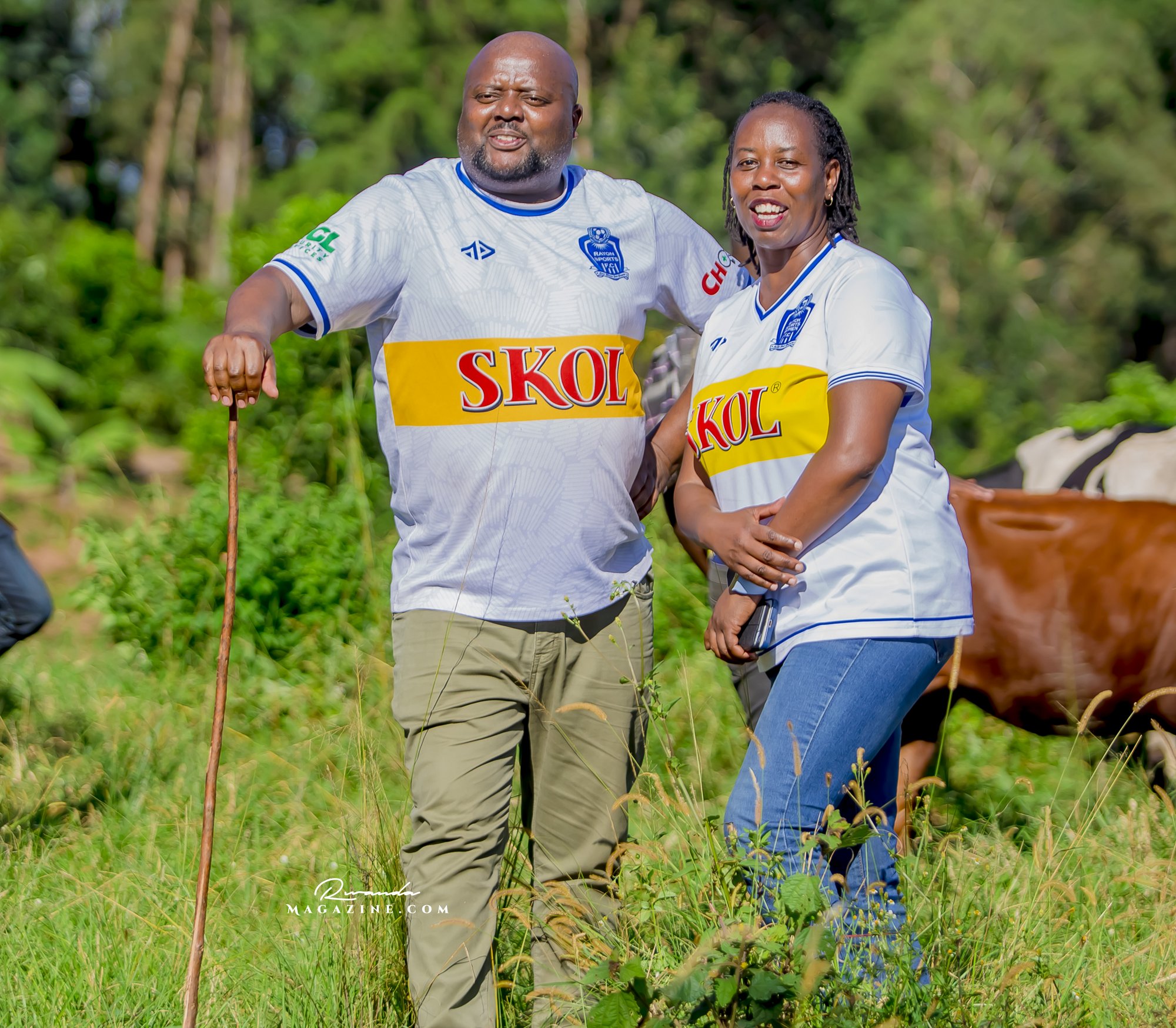 Claude Muhawenimana, umuyobozi w’abafana ba Rayon Sports na Uwimana Jeanine , Presidente w’icyubahiro wa Rayon Sports WFC bishimiye inka bagabiwe