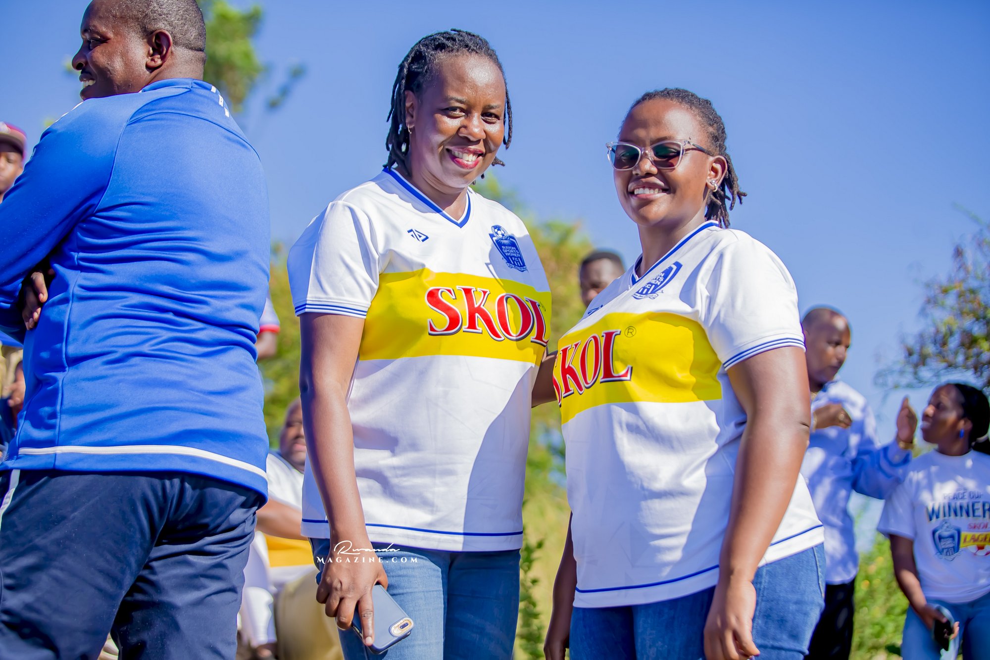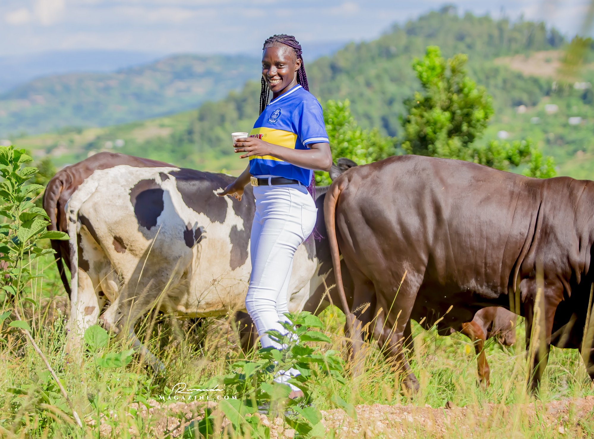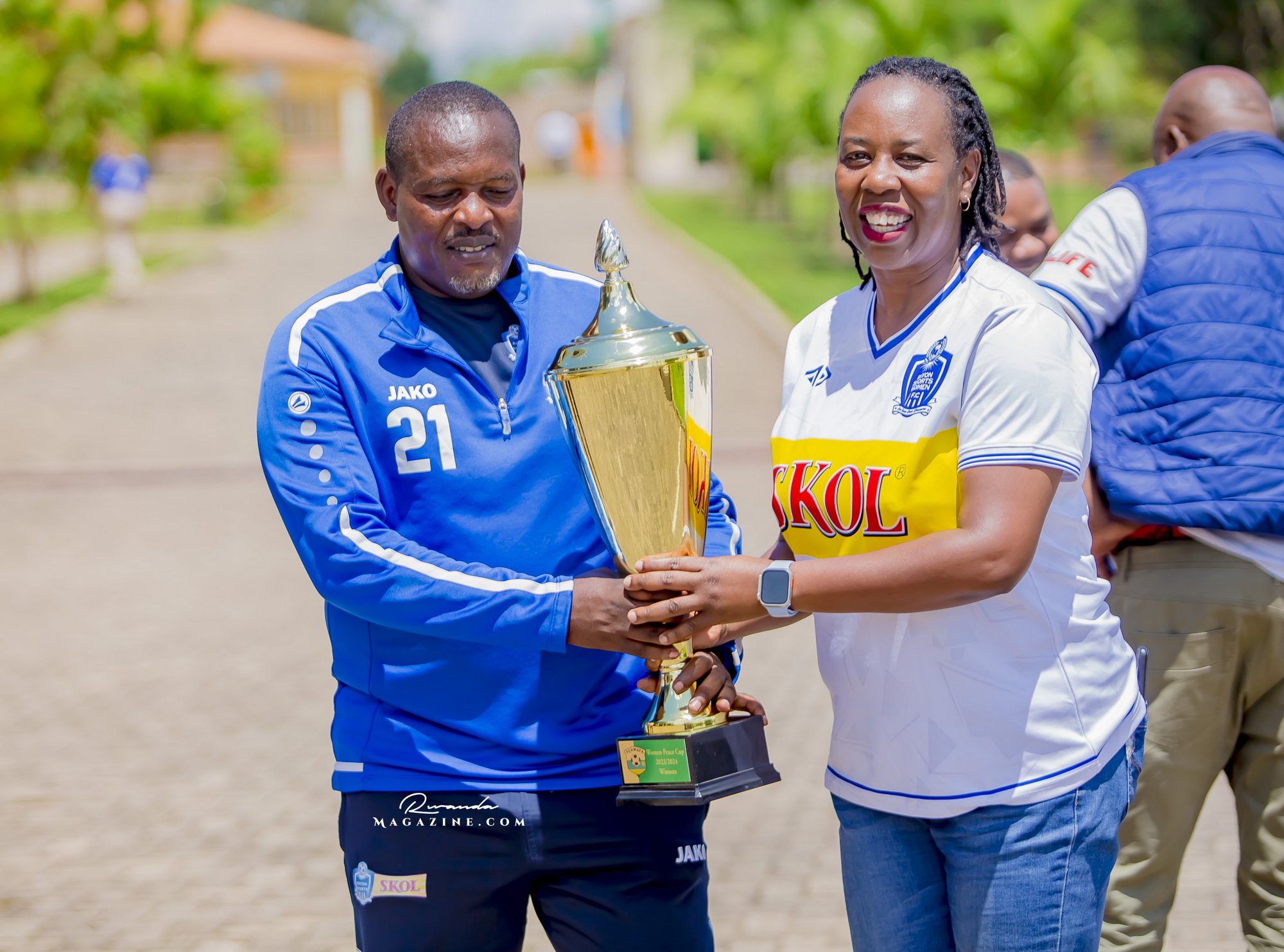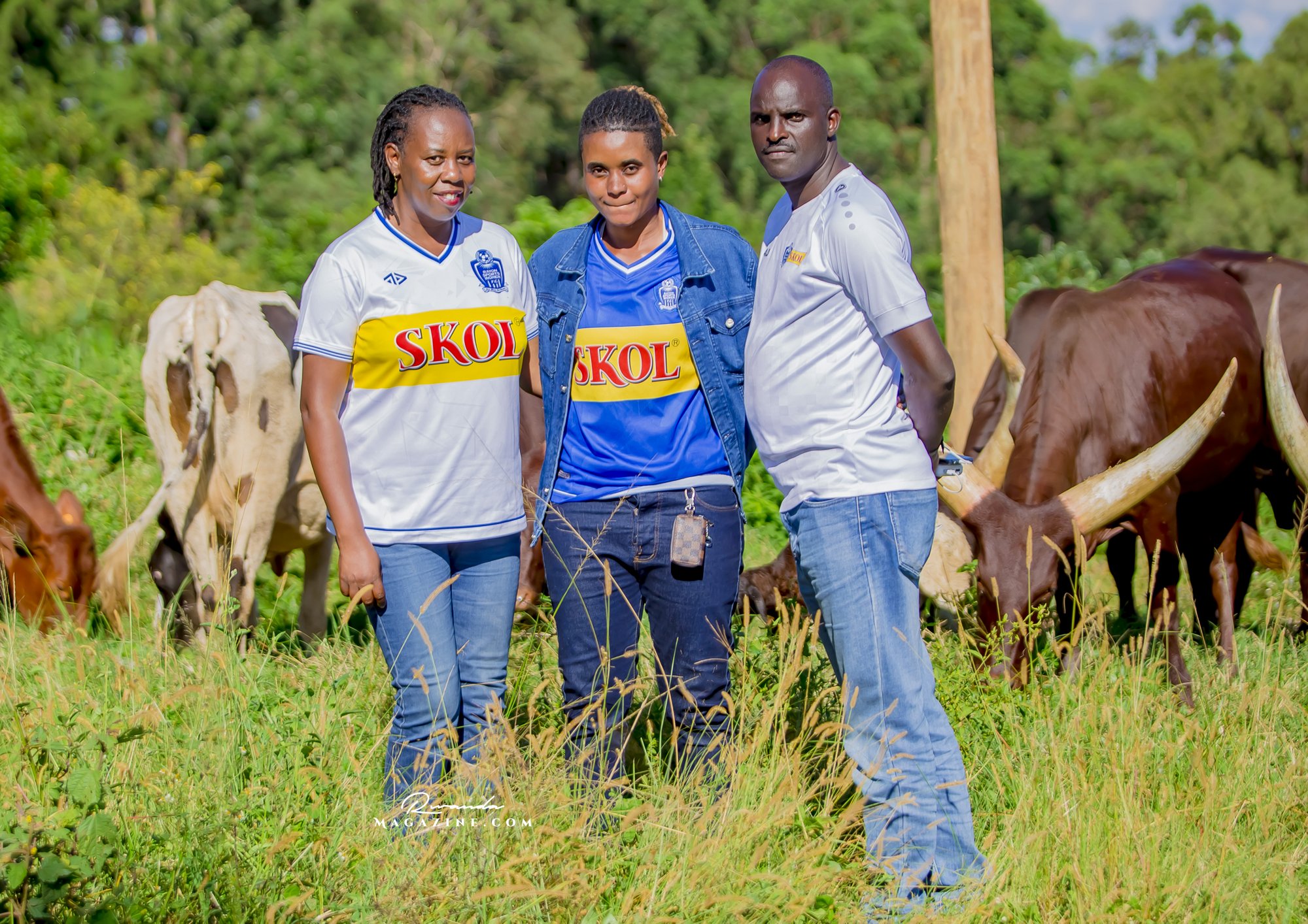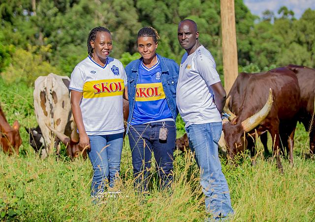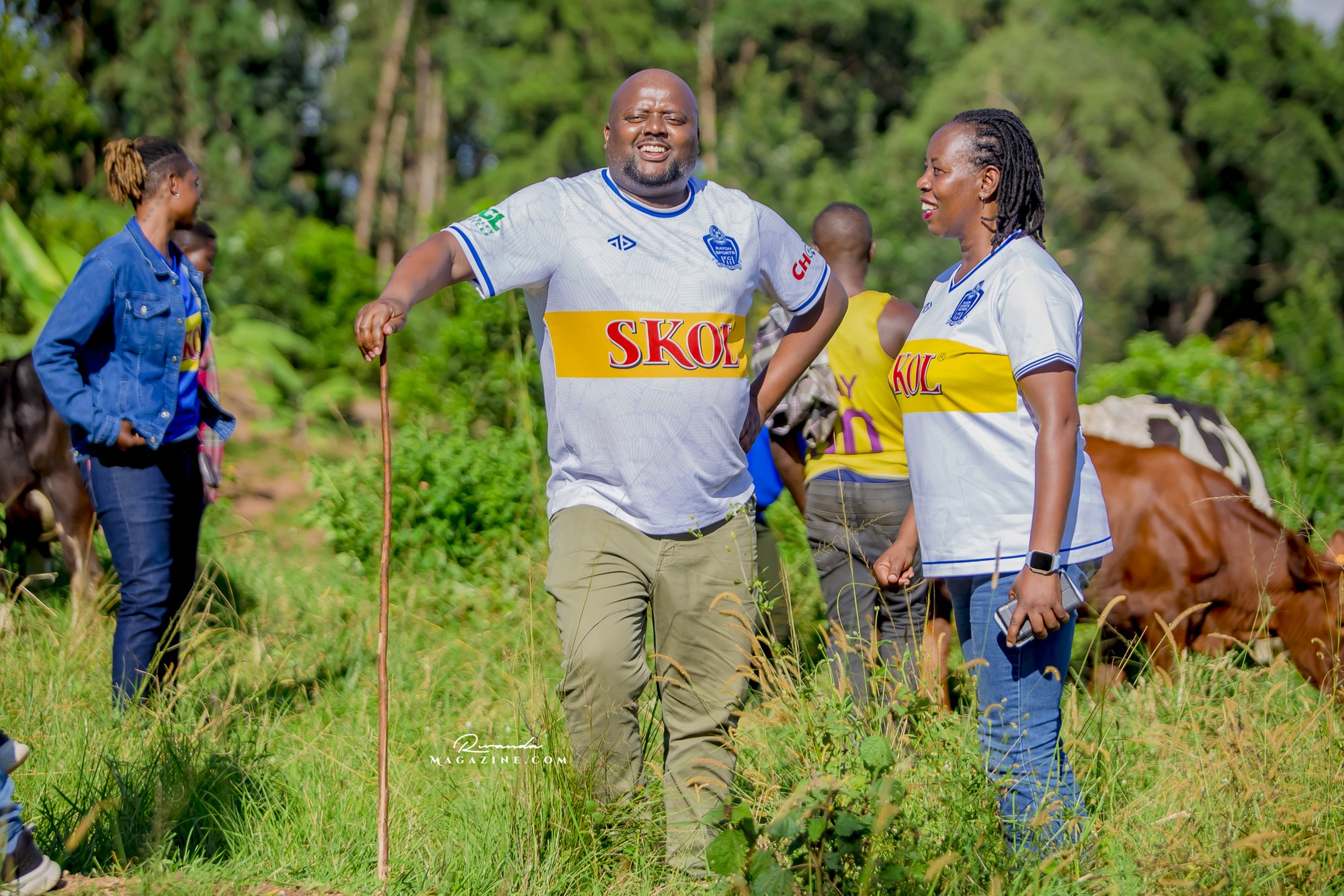 Claude Muhawenimana, umuyobozi w’abafana ba Rayon Sports na Uwimana Jeanine , Presidente w’icyubahiro wa Rayon Sports WFC bishimiye inka bagabiwe